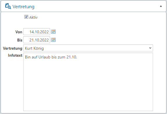 In der Registerkarte Vertretung legen Sie fest, wer während Ihrer Abwesenheit eine Nachricht bekommt.
