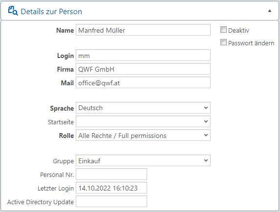 Wenn eine Person nicht mehr benötigt wird, kann sie deaktiviert werden. Diese Person kann dann nicht mehr in einer Auswahl verwendet werden. Gleichzeitig wird die Anmeldung am System gesperrt. |