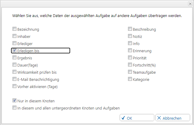 - Geben Sie an, welche Felder übertragen werden sollen. Es werden nur die angehakten Felder in die anderen Aufgaben übernommen. Nicht angehakte Felder bleiben unberührt.