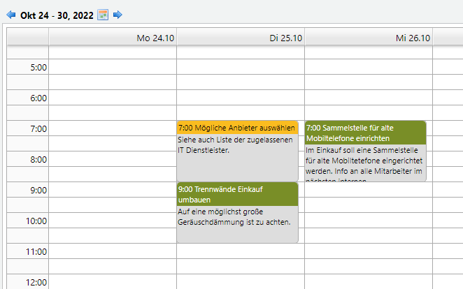 Im Wochenkalender werden die gleichen Farben wie in der Ampel der Aufgabenliste verwendet. Durch Klicken auf einen Kalendereintrag gelangt man direkt zur Aufgabe.