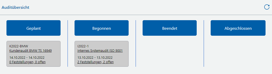 In der Auditübersicht werden alle Audits dem jeweiligen Status zugeordnet dargestellt.