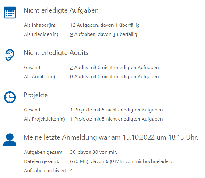 Bedienung Cockpit Im Cockpit wird eine Zusammenfassung der Aufgaben, Audits und Projekte des angemeldeten Benutzers angezeigt. Das Cockpit erschein dann, wenn alle Registerkarten geschlossen sind. Bild: Beispiel Cockpit