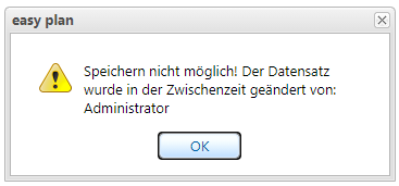 Wenn derselbe Datensatz von zwei oder mehr Personen gleichzeitig geändert wird, zeigt viflow easy plan beim Speichern eine Fehlermeldung an. Der Datensatz lässt sich von der zweiten Person nicht mehr speichern. Damit wird verhindert, dass die zweite Person die Änderungen der ersten Person überschreiben.