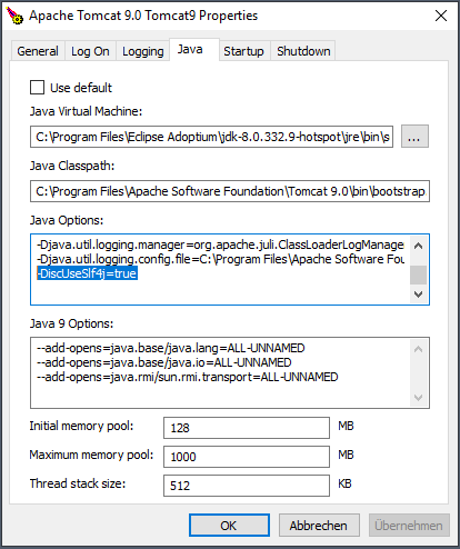 Bei den Java Options ergänzen Sie folgende Zeile: