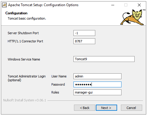 Geben Sie unbedingt einen „User Name“ und ein „Password“ für den Tomcat-Administrator an!