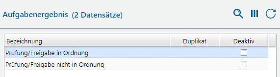 Im Katalog „Aufgabenergebnis“ legen Sie die Auswahlmöglichkeiten für das Feld „Ergebnis“ einer Aufgabe fest.
