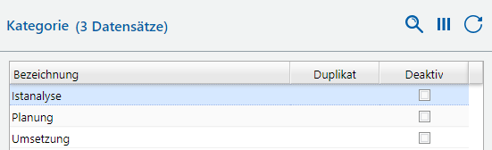 Im Katalog „Kategorie“ legen Sie die Auswahlmöglichkeiten für das Feld „Kategorie“ eines Arbeitspaketes fest.