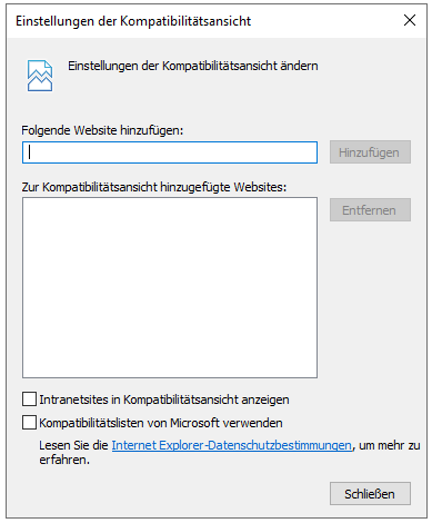 Wenn Sie den Internet Explorer verwenden, schalten Sie bitte unter Einstellungen der Kompatibilitätsansicht die Option „Intranetsites in Kompatibilitätsansicht zeigen“ aus.