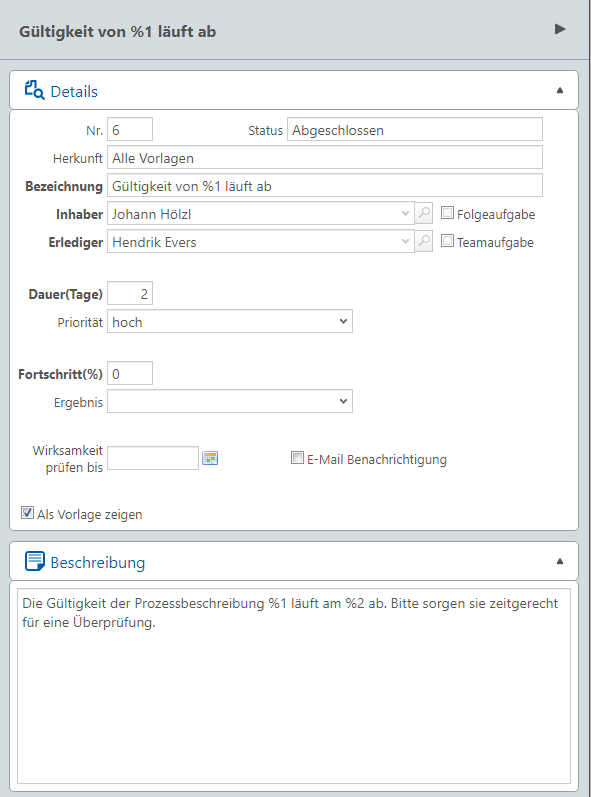 Wenn die Gültigkeit z.B. in 30 Tagen abläuft, erstellt viflow easy plan eine Aufgabe, basierend auf der konfigurierten Vorlage. Als Aufgabeninhaber wird der Modellierer verwendet, als Aufgabenerlediger die prozessverantwortliche Person.