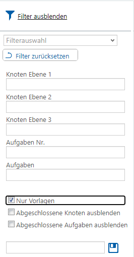 Um eine Aufgabenvorlage zu erstellen, öffnen Sie in der Aufgabenstruktur den Filter und aktivieren Sie die Checkbox für „Nur Vorlagen“.