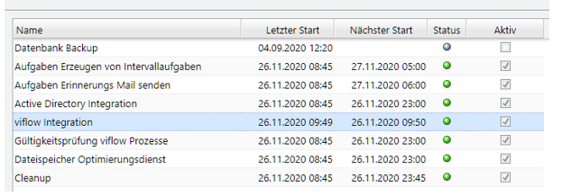 Für die Gültigkeitsprüfung von viflow-Prozessen muss der Dienst „Gültigkeitsprüfung von viflow-Prozessen“ aktiviert werden. Wir empfehlen hier ein tägliches Intervall zu verwenden.